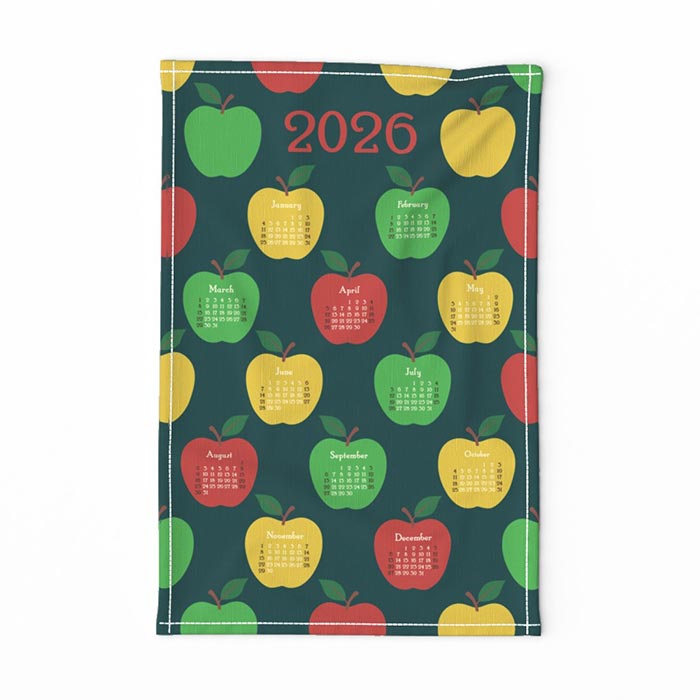 2026 Calendar colorful apples dark emerald green Tea Towel
