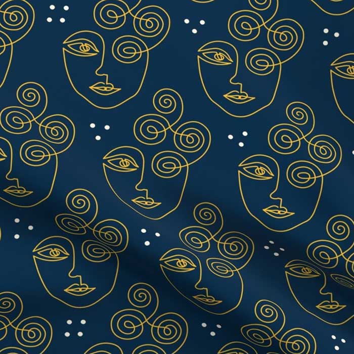 Boho Midnight Faces continuous line drawing navy blue yellow Cotton Fabric