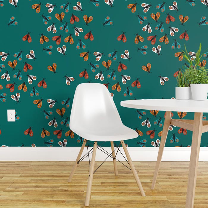 Colorful folk moths invasion on teal Prepasted Removable Wallpaper