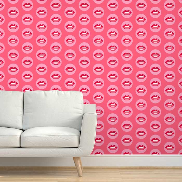 Lips pixels retro circles pink coral red Removable Wallpaper