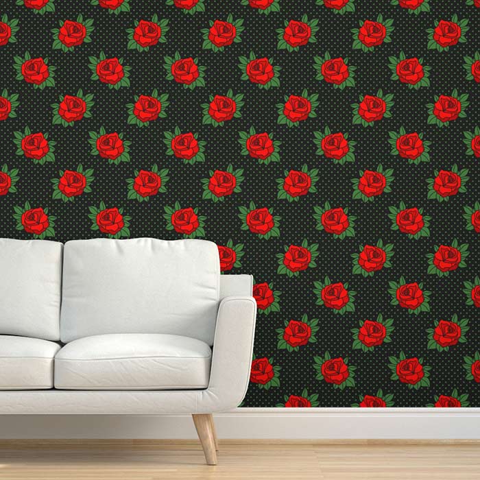 Peel & Stick Wallpaper Rockabilly true red rose green polka dots Retro tattoo