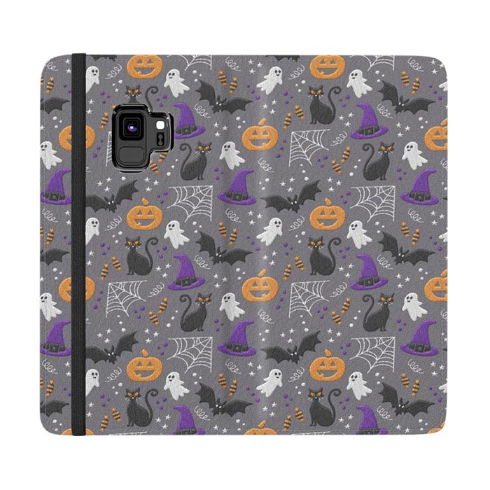 Samsung Galaxy S9 Wallet Case Halloween party symbols grey embroidery print